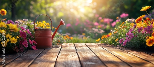 Obraz premium Sunny garden, watering can, flowers, wood deck, spring
