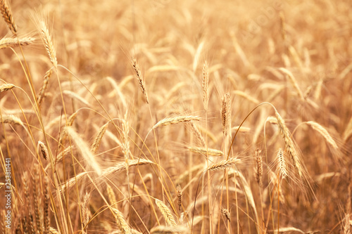 Fototapeta premium Sunny golden wheat field, ears of wheat close up background