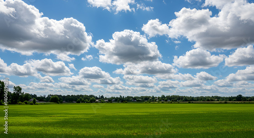 © egavirgian art, Fototapeta premium Sunny Green Field with Puffy Clouds and Blue Sky Landscape Scene