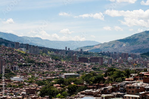 © Giordano, Naklejka premium Sunny hilly urban landscape Medellin city. Buildings and trees in mountains with blue and cloudy sky. Andes mountain range in the background.