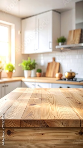© Ajaz, Fototapeta premium Sunny kitchen with wood countertop, white cabinets, plants