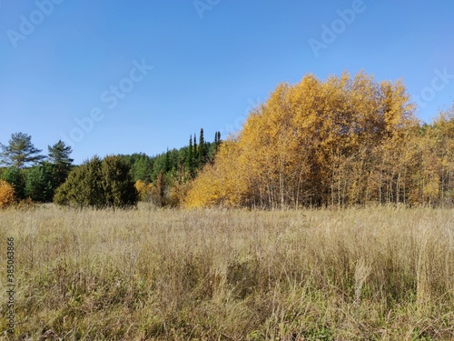 © Sergey Egovkin, Obraz premium sunny landscape with beautiful autumn trees against the blue sky