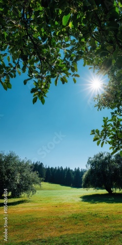 Fototapeta premium Sunny landscape with bright green field and blue sky framed by trees