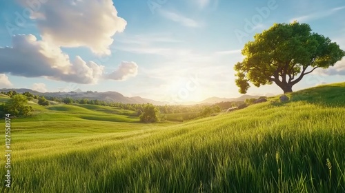 Obraz premium Sunny landscape with lush green fields, a solitary tree, and a bright blue...