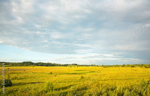 © Aleksey Sergeychik, Fototapeta premium sunny landscape with meadows, trees and lots of flowers against the blue sky