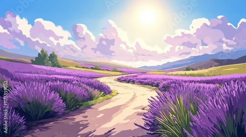 © arri, Fototapeta premium Sunny Lavender Fields Path Through Rolling Hills