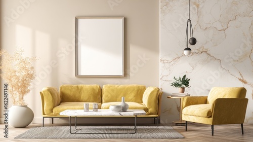 © GoenarsoBimo, Fototapeta premium Sunny living space with yellow sofa, chair, marble accent wall, and blank picture frame