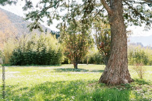 © VolodymyrNadtochii, Fototapeta premium Sunny meadow blooming with white flowers near a pine tree