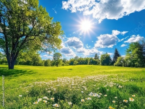 Obraz premium Sunny Meadow Landscape with Daisies and Trees on a Bright Day Wide Angle...