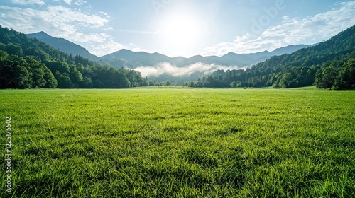 Fototapeta premium Sunny meadow, mountain backdrop, tranquil scene, nature background, travel...