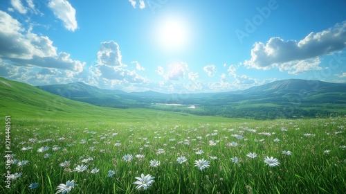 © AFFANYUDA, Obraz premium Sunny meadow, mountain view, daisies, idyllic landscape, travel