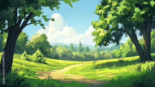 Fototapeta premium Sunny Meadow Path Through Lush Green Forest Landscape