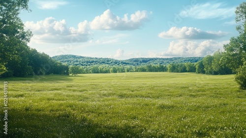 Fototapeta premium Sunny meadow, rolling hills, peaceful countryside, summer day, nature...