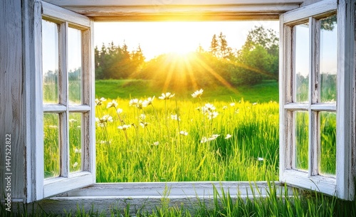 Obraz premium Sunny meadow view through open window