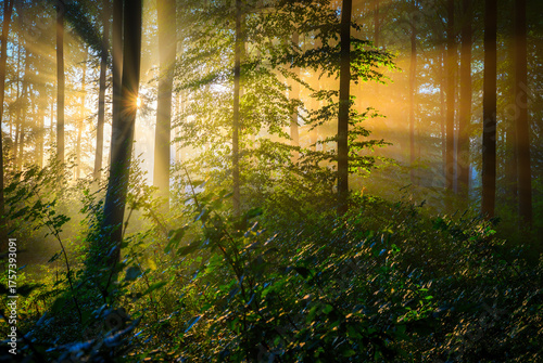 Obraz premium Sunny morning in green beech forest