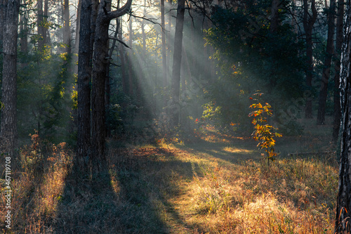 Fototapeta premium Sunny morning in the forest. Beginning of autumn. Sunlight plays in the...
