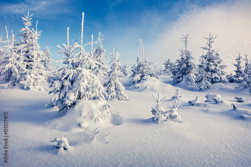 © Andrew Mayovskyy, Obraz premium Sunny morning scene in the mountain forest.