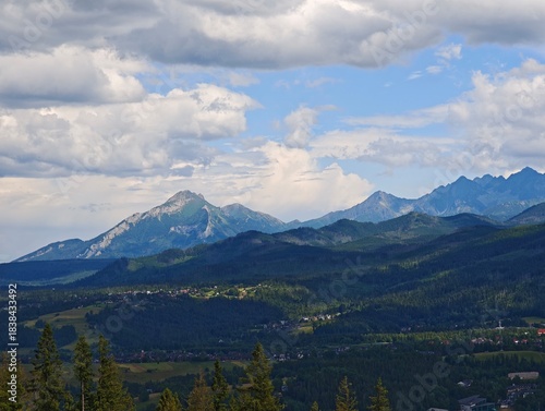 © RomanR, Fototapeta premium Sunny mountain landscape with town surrounded by forest and clear sky