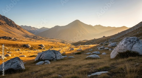 Fototapeta premium Sunny mountain valley scene with rocks, dry grass, and peak bathed in golden...