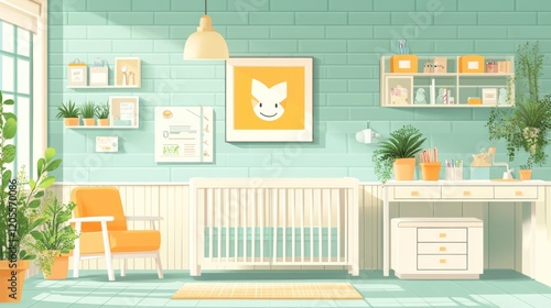 © Almahyra, Obraz premium Sunny nursery room with crib, changing table, and plants.