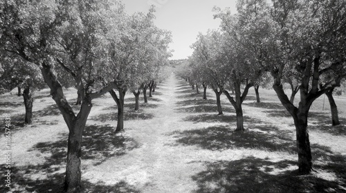 Naklejka premium Sunny orchard with rows of trees casting shadows on the ground in a serene...