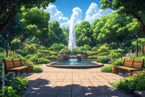© sennauli, Fototapeta premium Sunny park fountain, lush greenery, benches, relaxing scene, background trees