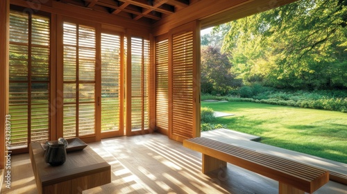© azi, Obraz premium Sunny patio with wooden furniture and garden view.