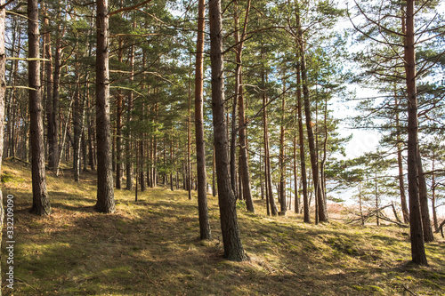Fototapeta premium Sunny pine tree forest next to the sea