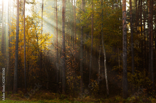 © alexander132, Naklejka premium Sunny rays in morning forest. Sunlight between pines. Beautiful landscape