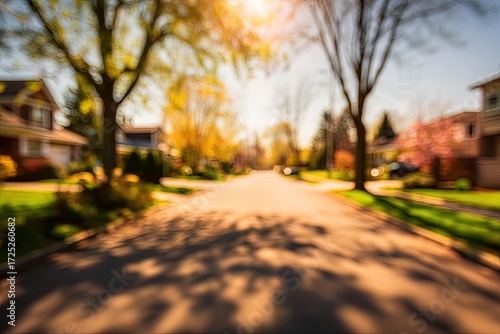 © HermanCreative, Naklejka premium Sunny Residential Street With Defocused Houses And Trees