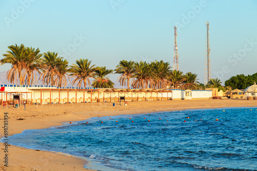 Fototapeta premium Sunny resort beach with palm trees and umbrellas.