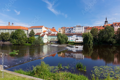 Fototapeta premium Sunny royal medieval Town Pisek above the River Otava, Czech Republic