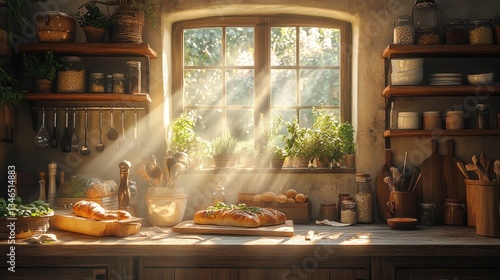 © MABRUR, Fototapeta premium Sunny rustic kitchen window with bread