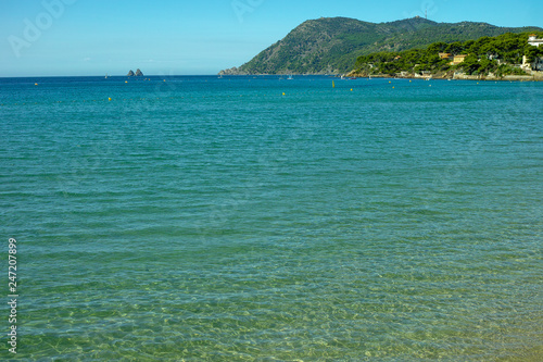 © barmalini, Obraz premium Sunny sandy beach vacation, landscape with clear blue sea shore and sandy beach