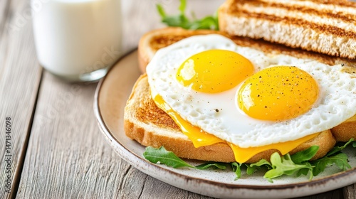 Fototapeta premium Sunny-Side Up: Close-up of a delicious breakfast consisting of toast and eggs. captured in a warm, inviting style.