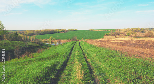 Fototapeta premium Sunny spring landscape with ground country road passing through the fields