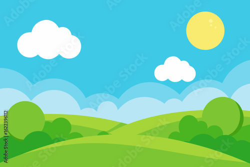 © Chamok Chandra, Fototapeta premium Sunny Spring Meadow Cartoon Background with Clear Sky and Clouds