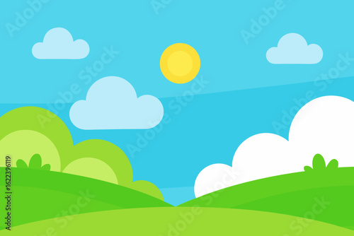 © Chamok Chandra, Fototapeta premium Sunny Spring Meadow Cartoon Background with Clear Sky and Clouds