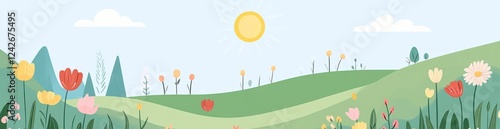 © BerkahStock, Fototapeta premium Sunny spring meadow landscape with colorful flowers and rolling hills.