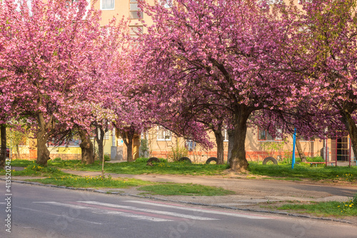 © larauhryn, Naklejka premium Sunny street of the small cozy European town during japanese cherry or sakura tree blossom, beautiful spring cityscape, outdoor travel background, Uzhhorod, Ukraine