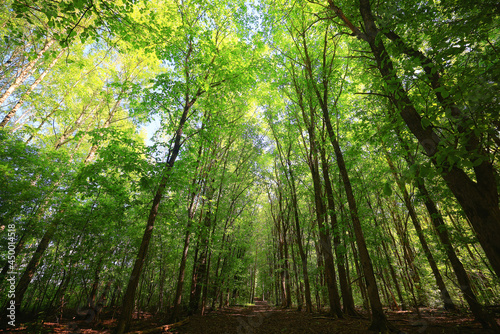Obraz premium sunny summer day in green park, beautiful landscape trees background