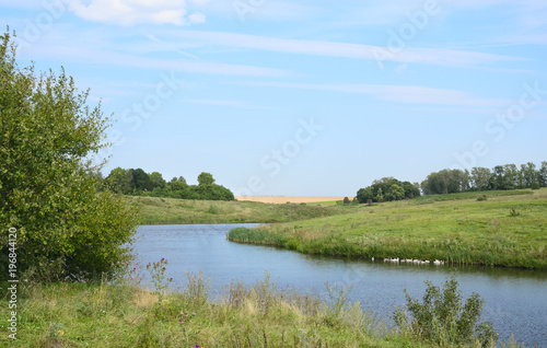 © valeriy boyarskiy, Fototapeta premium Sunny summer landscape.Green hills,fields and meadows.River Krasivaya Mecha in Tula region,Russia.Countryside scene.Bright blue sky with clouds.