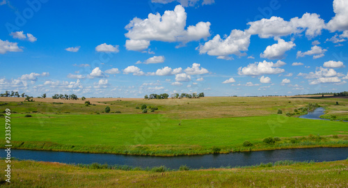 © valeriy boyarskiy, Obraz premium Sunny summer landscape with fields,bending river and beautiful woods.
