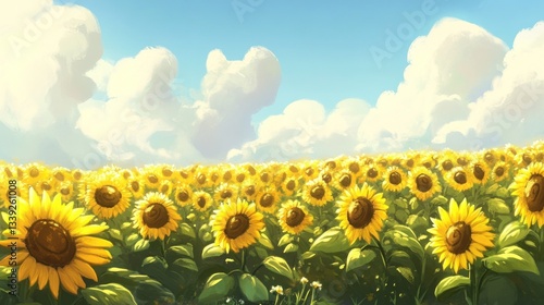 Fototapeta premium Sunny Sunflower Field, Summer Sky, Idyllic Landscape, Background, Illustration
