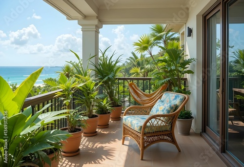 Fototapeta premium sunny tropical balcony with wicker chair, hammock and ocean vista