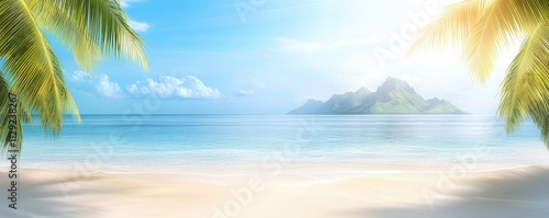 Fototapeta premium Sunny tropical beach featuring palm leaves and a distant paradise island...
