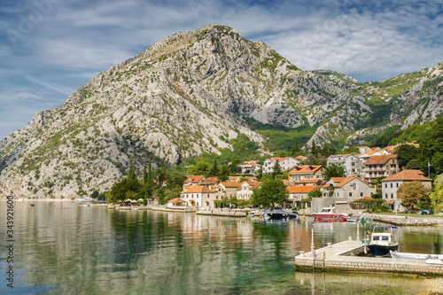 Fototapeta premium Sunny view of beautiful village Orahovac on Kotor Bay, Montenegro.