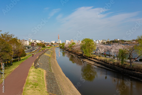 © Kit Leong, Naklejka premium Sunny view of the cherry blossom along the Senba Lake