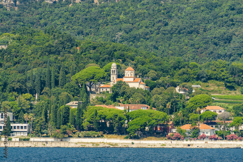 Fototapeta premium Sunny view of the Herceg Novi from the sea on the background of mountains,...