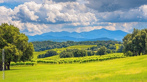 © arda, Fototapeta premium Sunny vineyard landscape with mountains in background